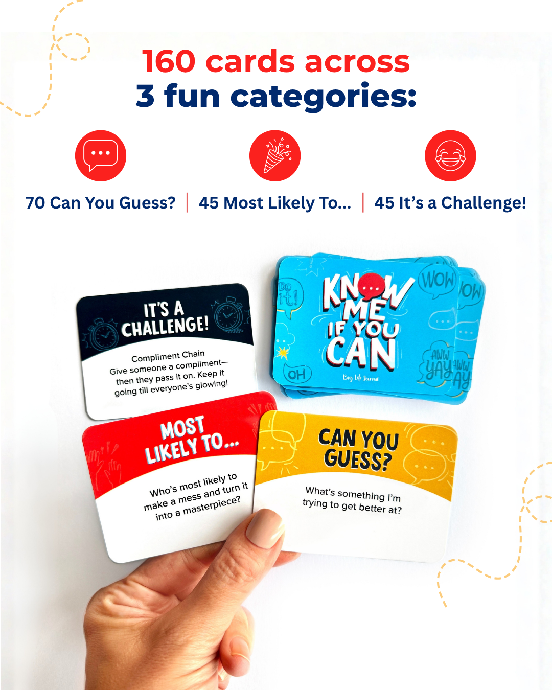 There are 160 cards total, divided into 3 playful categories for nonstop fun and connection.